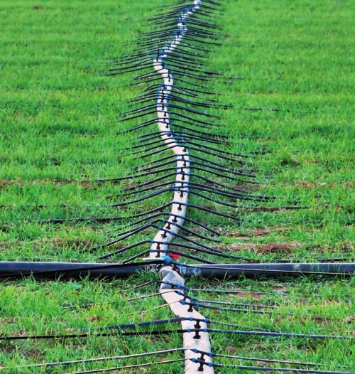 河南省衛(wèi)輝市高標(biāo)準(zhǔn)農(nóng)田內(nèi)的節(jié)水滴灌系統(tǒng)在灌溉麥苗(2025年2月12日攝) 劉振坤攝/本刊