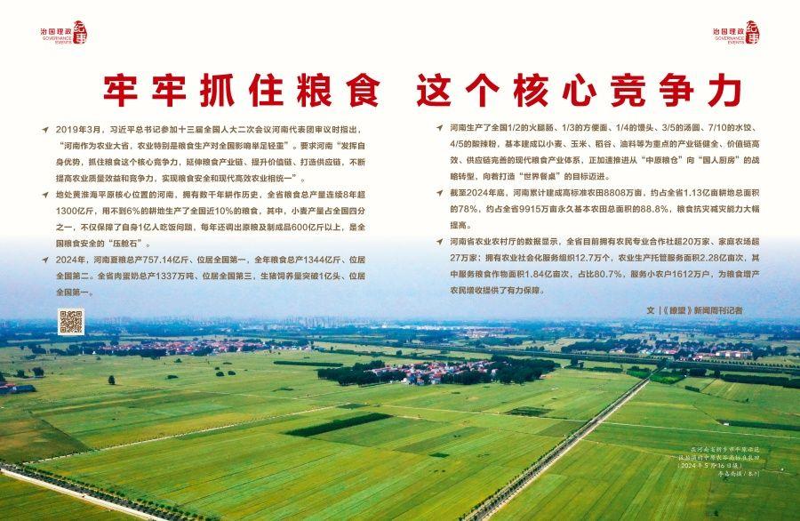 ◇地處黃淮海平原核心位置的河南,擁有數(shù)千年耕作歷史,全省糧食總產(chǎn)量連續(xù)8年超1300億斤,用不到6%的耕地生產(chǎn)了全國近10%的糧食,其中,小麥產(chǎn)量占全國四分之一,不僅保障了自身1億人吃飯問題,每年還調(diào)出原糧及制成品600億斤以上,是全國糧食安全的“壓艙石”。