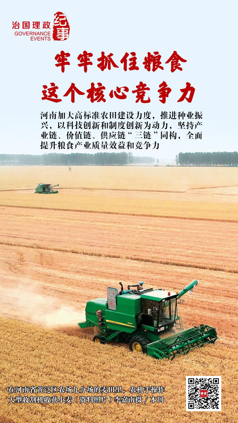 ◇2019年3月,習(xí)近平總書記參加十三屆全國人大二次會議河南代表團(tuán)審議時指出,“河南作為農(nóng)業(yè)大省,農(nóng)業(yè)特別是糧食生產(chǎn)對全國影響舉足輕重”。要求河南“發(fā)揮自身優(yōu)勢,抓住糧食這個核心競爭力,延伸糧食產(chǎn)業(yè)鏈、提升價值鏈、打造供應(yīng)鏈,不斷提高農(nóng)業(yè)質(zhì)量效益和競爭力,實現(xiàn)糧食安全和現(xiàn)代高效農(nóng)業(yè)相統(tǒng)一”。