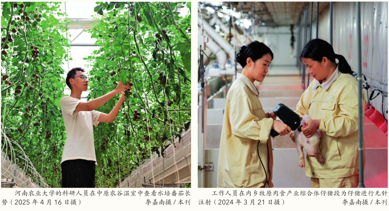 一望無際的麥田里,農(nóng)民正忙著灌溉、打藥;實驗室里,多個品種的小麥正在茁壯生長,人工氣候室實現(xiàn)小麥“一年五熟”,大大縮短育種周期;麥田上空,專職“飛手”操控的無人機(jī)正噴灑農(nóng)藥……7000多年前,河南新鄭市的裴李崗村便出現(xiàn)了粟、黍、稻的種植,被譽為中華農(nóng)耕文明起源地,如今,這里所在的黃淮海平原依然是我國糧食生產(chǎn)核心區(qū)。