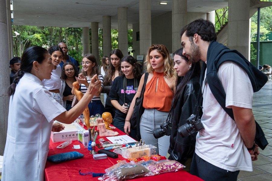 2025年4月15日,在巴西里約熱內(nèi)盧天主教大學(xué)舉辦的“國際中文日”慶?;顒由?,學(xué)生們觀看中醫(yī)療法展示。新華社記者 王天聰 攝