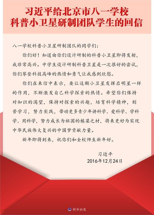 三個多月后,同學(xué)們給習(xí)近平總書記寫信,報告小衛(wèi)星即將發(fā)射的消息,很快收到了總書記的回信。習(xí)近平總書記在回信中說,“你們攀登科技高峰的熱情和勇氣讓我感到欣慰”“希望你們保持對知識的渴望,保持對探索的興趣,培育科學(xué)精神,刻苦學(xué)習(xí),努力實踐,帶動更多青少年講科學(xué)、愛科學(xué)、學(xué)科學(xué)、用科學(xué),努力成長為祖國的棟梁之材”。