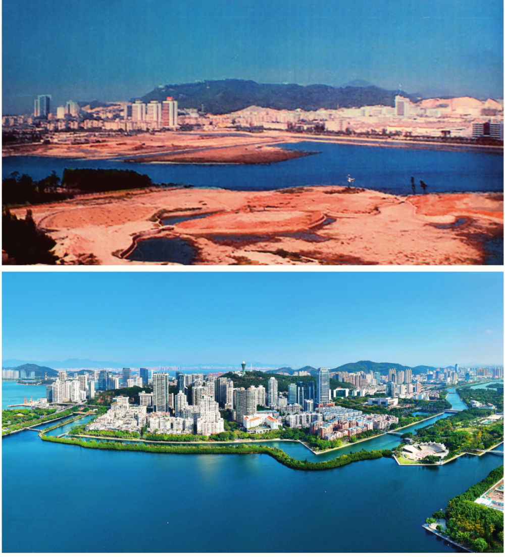 拼版照片:上圖為20世紀(jì)80年代的廈門(mén)筼筜湖(資料照片);下圖為廈門(mén)筼筜湖及周邊城市景觀(2024年1月24日攝 姜克紅攝/本刊)