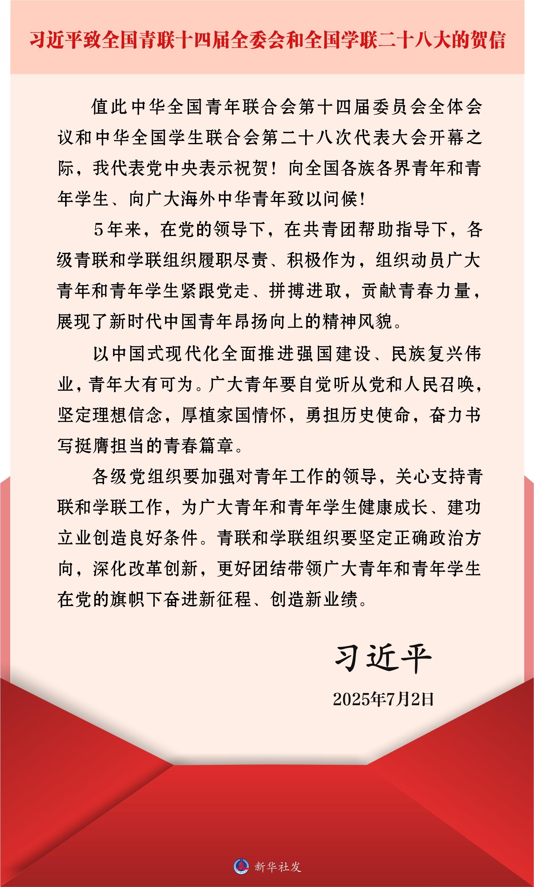 新華社北京7月2日電 中華全國青年聯(lián)合會第十四屆委員會全體會議、中華全國學(xué)生聯(lián)合會第二十八次代表大會2日上午在京開幕。中共中央總書記、國家主席、中央軍委主席習(xí)近平發(fā)來賀信,代表黨中央表示祝賀,向全國各族各界青年和青年學(xué)生、向廣大海外中華青年致以問候。