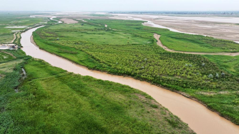 這是2025年6月22日在寧夏平羅縣境內(nèi)拍攝的黃河灘涂濕地(無人機照片)。新華社記者 王鵬 攝
