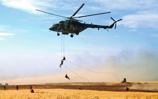 在俄羅斯奧倫堡州東古茲靶場(chǎng)舉行的“和平使命-2021”上海合作組織聯(lián)合反恐軍事演習(xí)實(shí)兵實(shí)彈演習(xí)中,多國(guó)聯(lián)合部隊(duì)特戰(zhàn)分隊(duì)執(zhí)行索降作戰(zhàn)任務(wù)(資料照片) 梅世雄攝/本刊