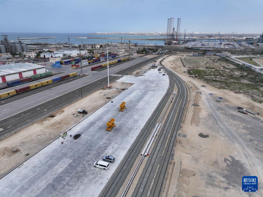 這是8月5日在哈薩克斯坦阿克套港拍攝的阿克套港集裝箱樞紐一期工程建設(shè)場景(無人機照片)。新華社記者 李任滋 攝