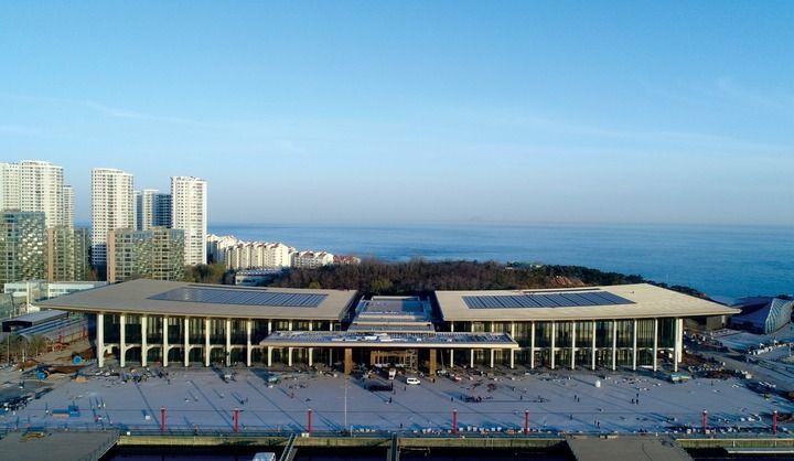 上合青島峰會主會場外景(2018年5月18日攝)。新華社發(fā)(中建八局供圖)