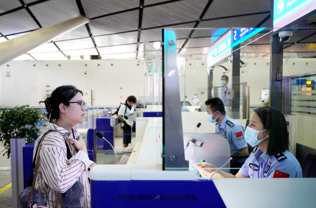 圖為南寧出入境邊防檢查站移民管理警察正在對出境旅客進(jìn)行證件查驗。梁簫 攝