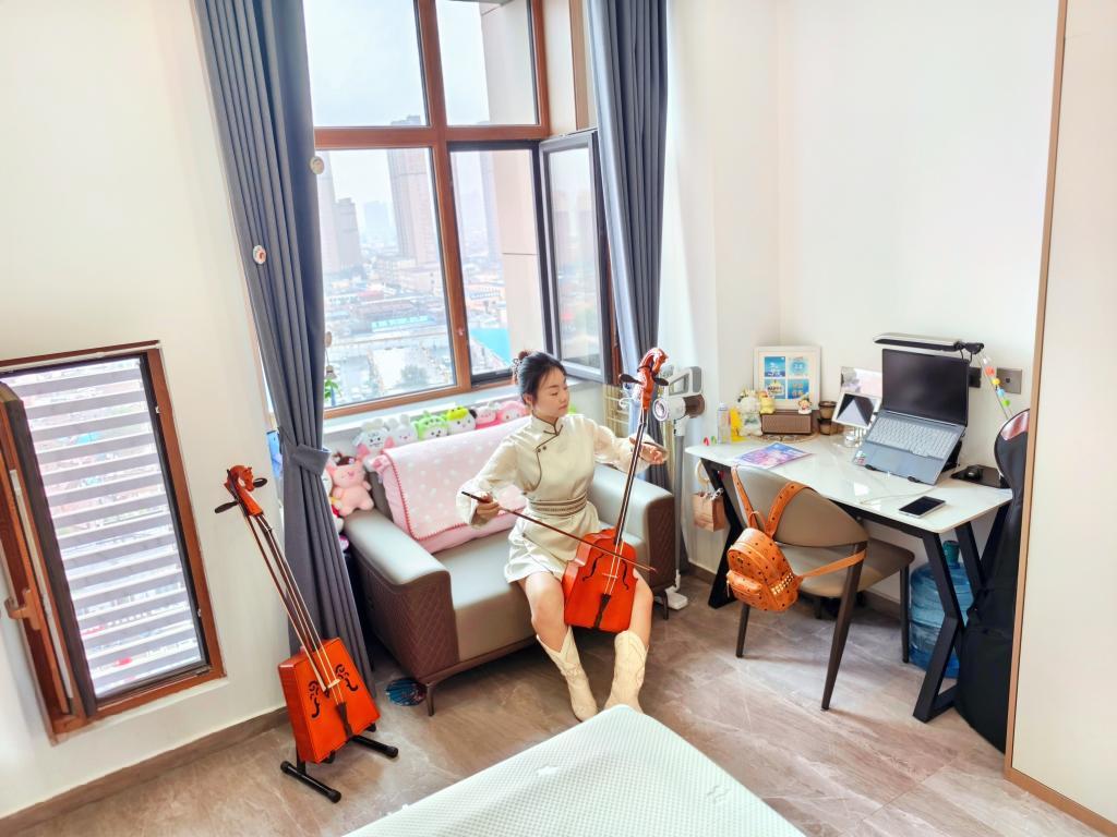 王禹驕在租住的青年公寓內(nèi)練習(xí)馬頭琴。(受訪者供圖)