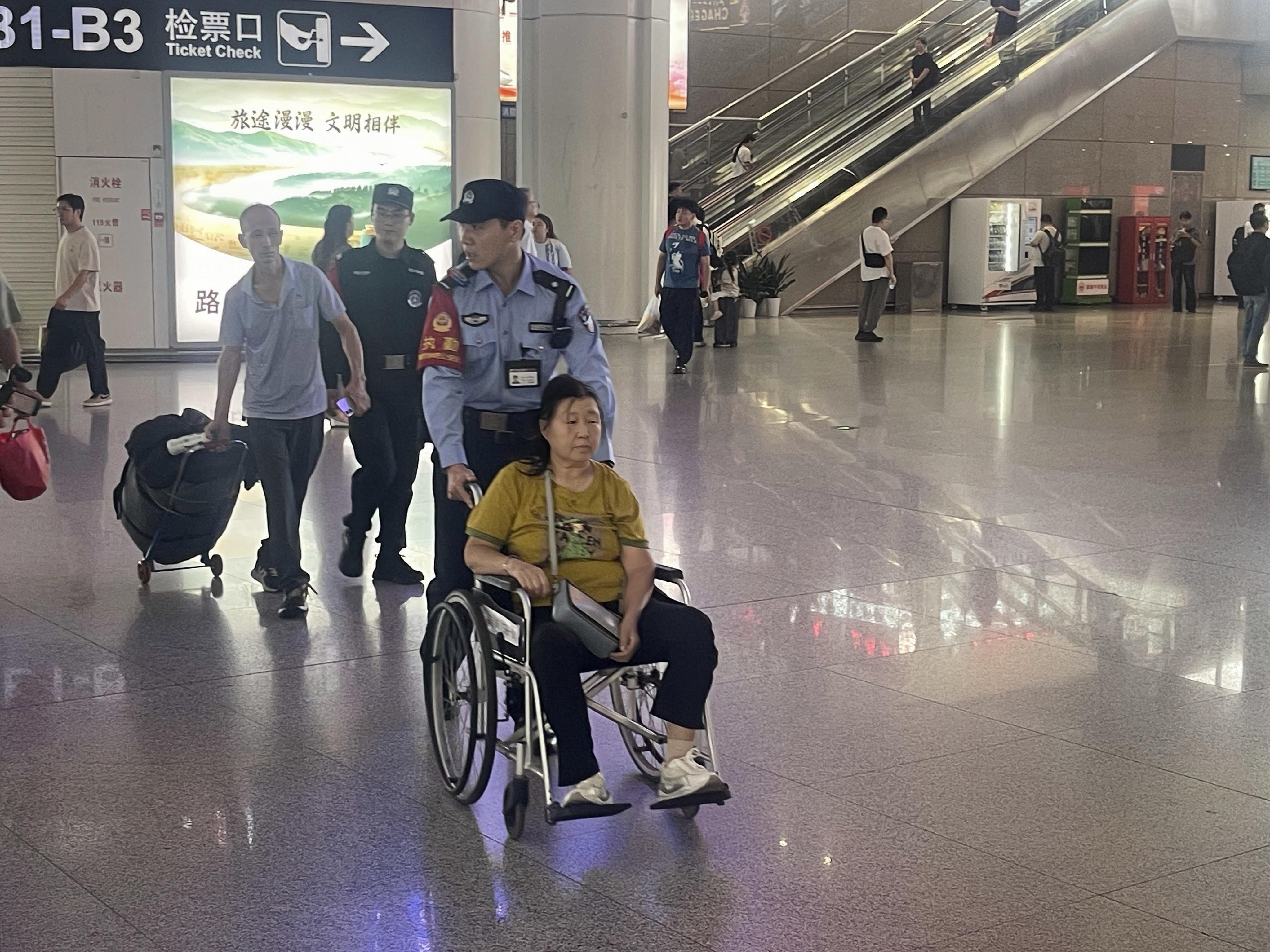 “警察同志,謝謝你們的幫助,讓我能順利回家?!避囌菊九_上,旅客劉女士與民警朱文皓揮手道別。