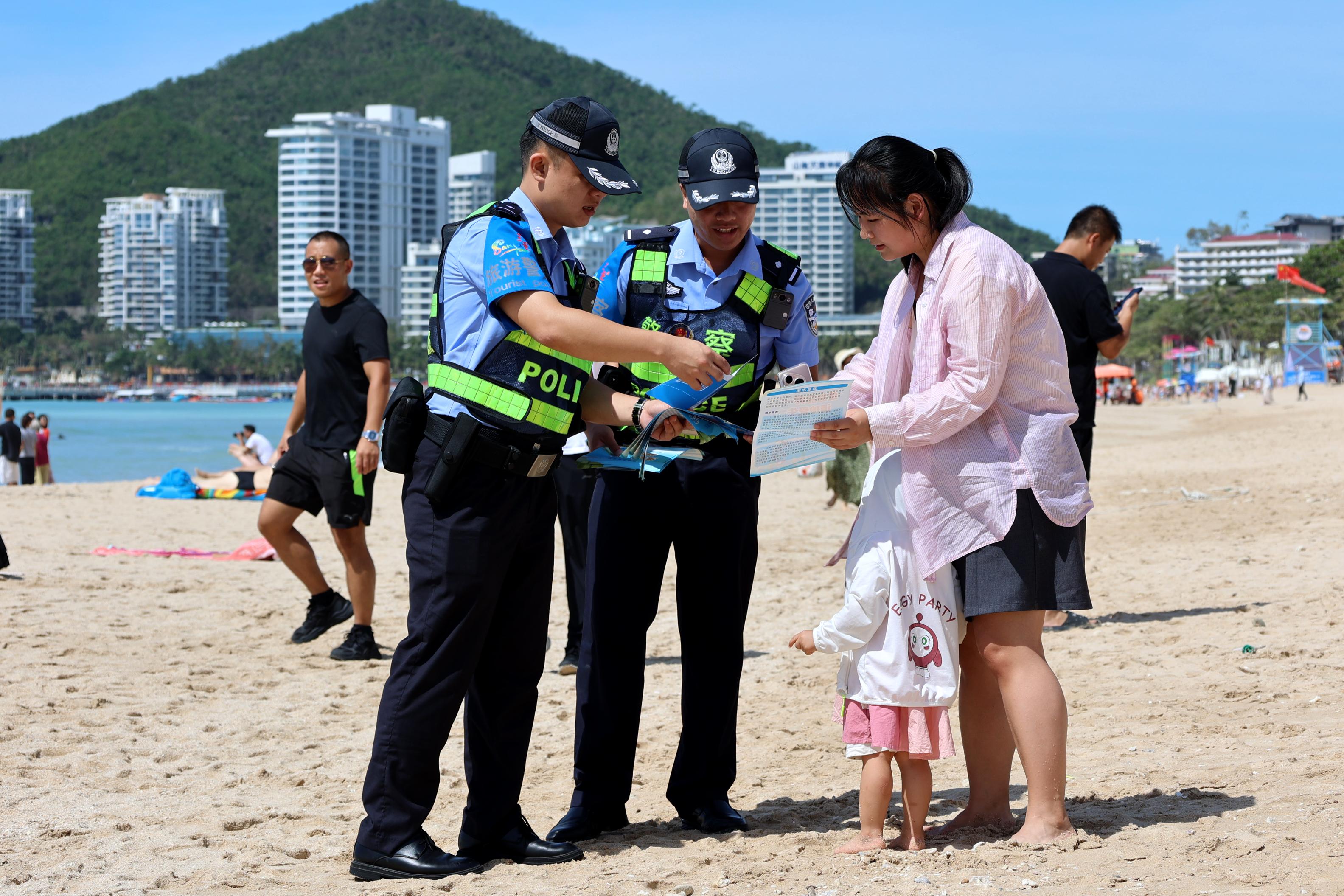 10月1日,民警在大東海巡邏防控,向游客開展反詐防溺水等安防宣傳。代龍超攝