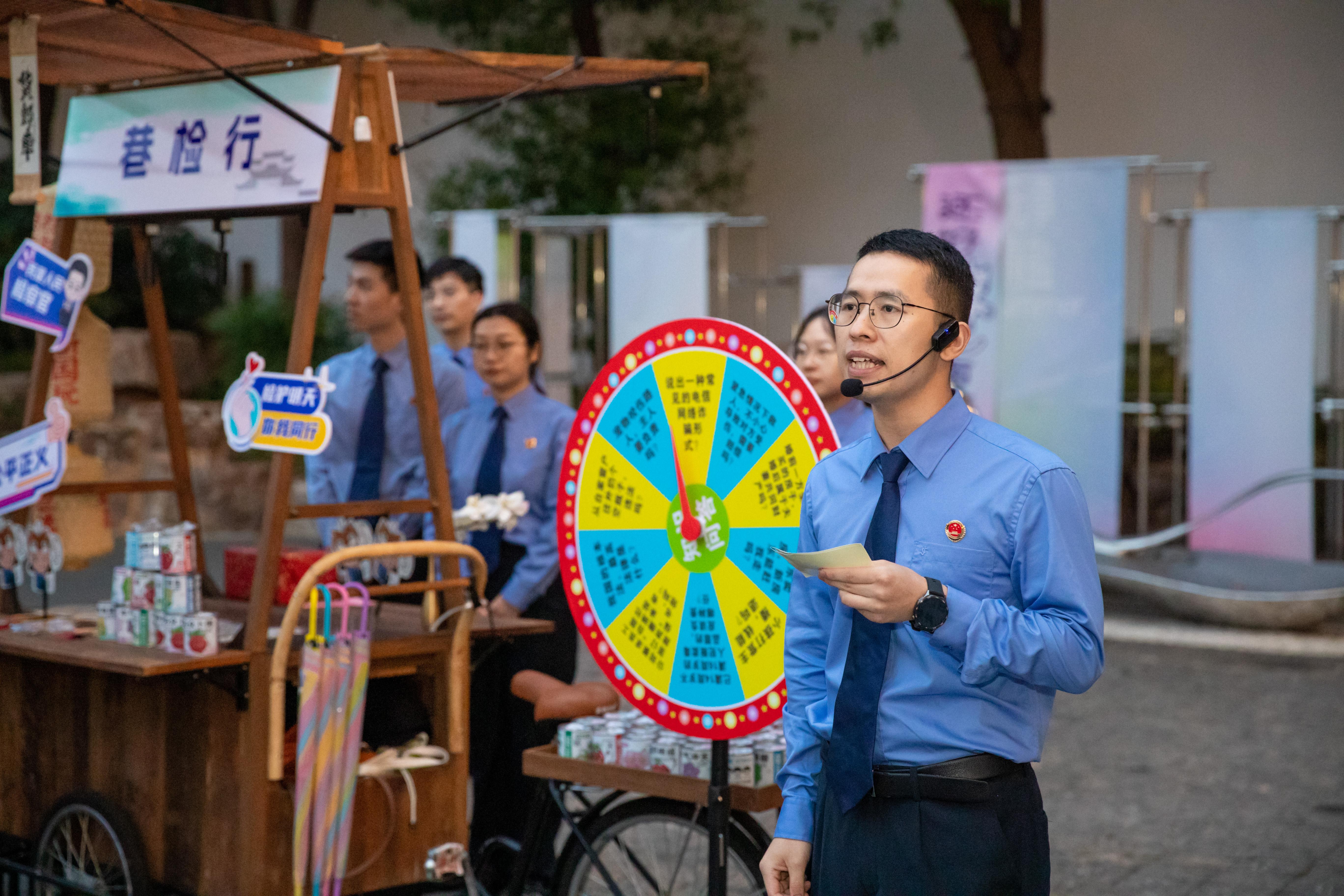 普法區(qū)咨詢區(qū)內(nèi),群眾正向檢察官咨詢關(guān)心的法律問(wèn)題,領(lǐng)取精心編制的養(yǎng)老防詐、未成年人保護(hù)、民法典等普法宣傳冊(cè),為家人和朋友帶一份“法治護(hù)身符”?!叭藲狻弊罡叩囊獢?shù)游戲互動(dòng)區(qū)了,群眾排隊(duì)做起了小游戲:輕輕一轉(zhuǎn)法治大轉(zhuǎn)盤,問(wèn)題可能是民法典生活百科,也可能是未成年人保護(hù)知識(shí),看看誰(shuí)是“法律知識(shí)小達(dá)人”;在法治盲盒中伸手一抽,一個(gè)個(gè)模擬真實(shí)生活的反詐情景躍然眼前:“刷單返利是陷阱嗎?”“客服打電話主動(dòng)退款怎么辦?”大家現(xiàn)場(chǎng)判斷,機(jī)智應(yīng)對(duì),有效提升防騙免疫力。在拍照打卡區(qū),群眾與萌態(tài)可掬的檢察官卡通形象合影留念,記錄下這個(gè)“有顏有法有趣”的美好夜晚。