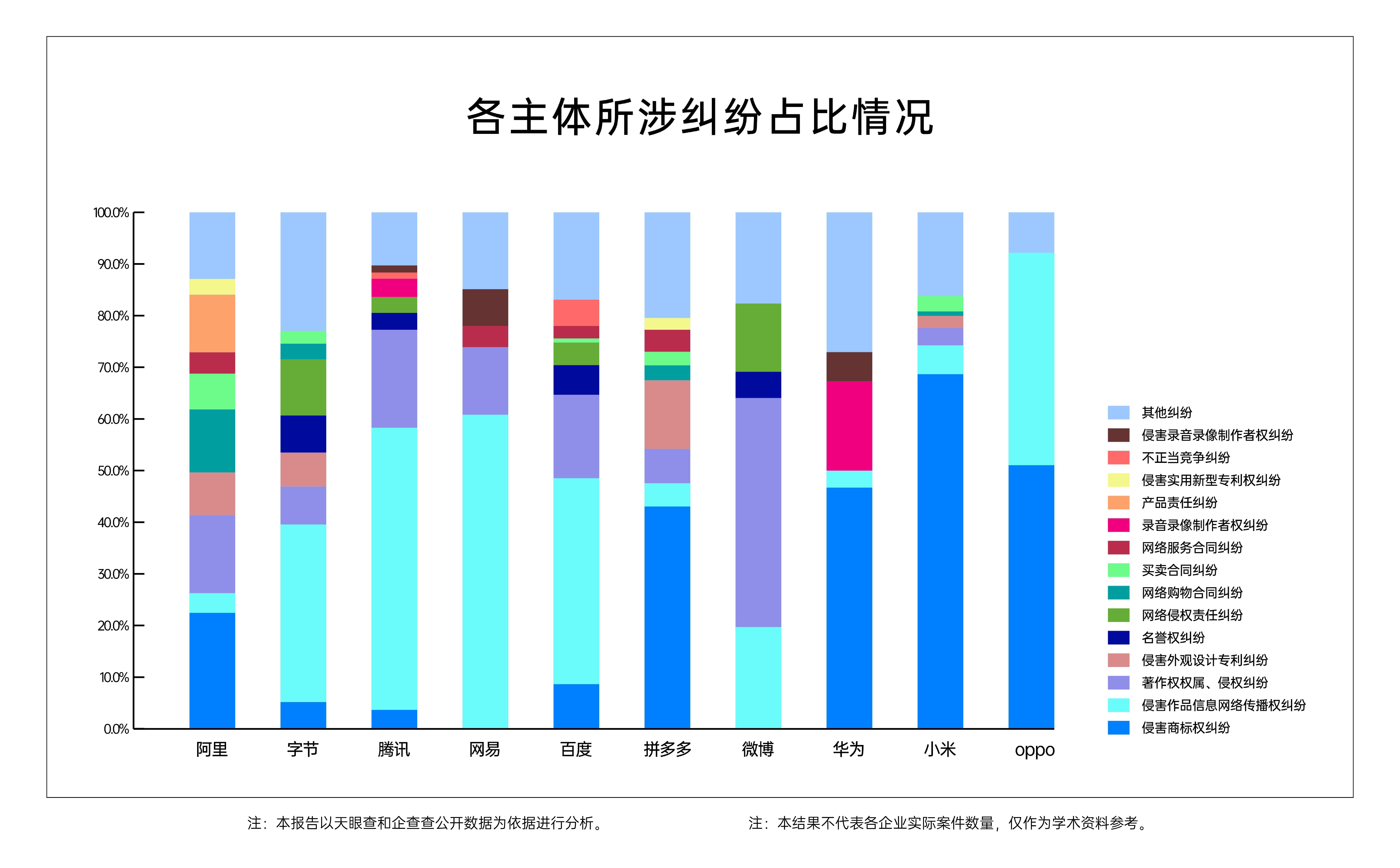 2.案件類型高度集中:作為訴訟主體的案件集中于知識(shí)產(chǎn)權(quán)領(lǐng)域,侵害商標(biāo)權(quán)糾紛、著作權(quán)權(quán)屬侵權(quán)糾紛、侵害作品信息網(wǎng)絡(luò)傳播權(quán)糾紛這三大類型案件在各主體的糾紛案件中占比均較高,占比相加的值均高于50%。