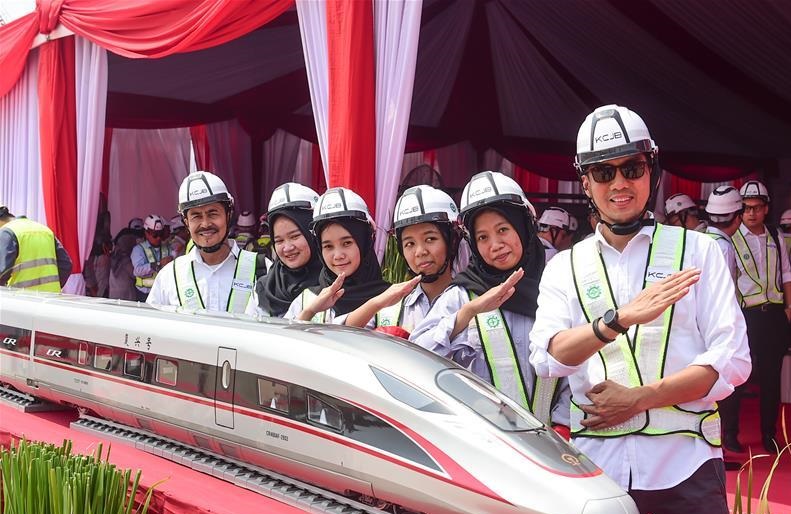 9月30日,在印尼雅萬高鐵首榀箱梁架設(shè)現(xiàn)場,幾名印尼嘉賓與“復(fù)興號(hào)”動(dòng)車模型合影。 新華社記者 杜宇 攝