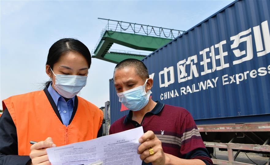 4月25日,中國鐵路南昌局集團有限公司海滄站貨運員李瑩(左)在廈門海滄站和發(fā)貨方代表辦理中歐班列貨物進站交接手續(xù)。 當(dāng)日,中歐班列X8098次貨物列車從福建廈門海滄站出發(fā),開往德國漢堡。這趟中歐班列搭載50個40尺標(biāo)準(zhǔn)集裝箱,裝有一次性防疫口罩、簡易呼吸器、輸液器、防護服等約468萬件防疫物資,以及服裝、電子產(chǎn)品等貨物。 據(jù)中國鐵路南昌局集團有限公司數(shù)據(jù)統(tǒng)計,2020年第一季度,漳州車務(wù)段海滄站已累計開行中歐班列66列,裝車3014輛,貨物價值約2億美元;與2019年同期相比,開行列數(shù)增長88%,裝運量增長196%,運輸收入增長219%。 新華社記者 魏培全 攝