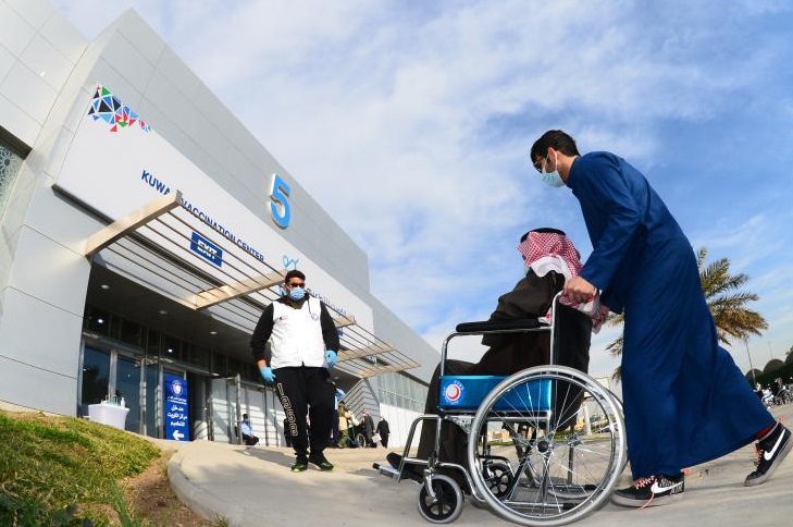 1月14日,在科威特哈瓦利省的新冠疫苗接種中心,一名老人坐輪椅前往接種第二劑新冠疫苗。