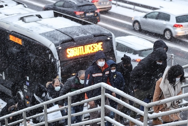 當(dāng)?shù)貢r間2月17日,土耳其伊斯坦布爾,人們戴著口罩行走在大雪中。(圖片來源:東方IC)