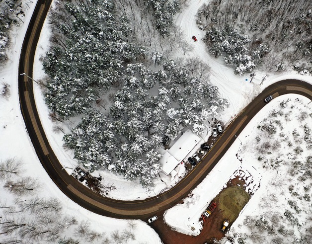 當(dāng)?shù)貢r(shí)間2月23日,土耳其科賈埃利,無人機(jī)航拍冬日雪景,車輛在蜿蜒的公路上行駛。(圖片來源:東方IC)
