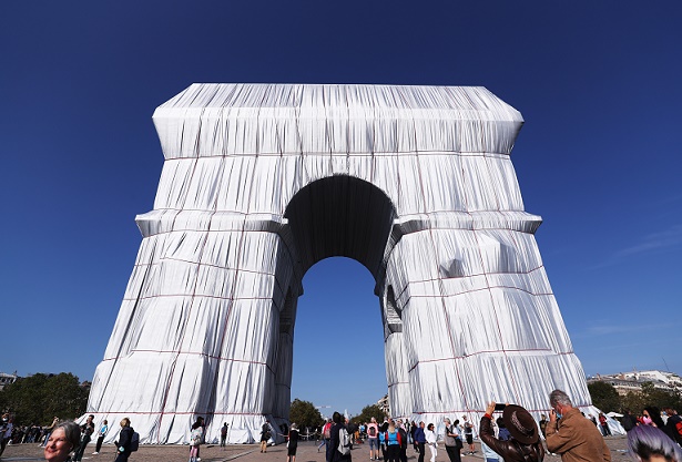 “被包裹的凱旋門”是保加利亞已故藝術(shù)家赫里斯托和妻子讓娜-克洛德的遺作。根據(jù)他們的構(gòu)思,巴黎地標(biāo)建筑凱旋門被可回收的織物包裹起來。目前,凱旋門已被2.5萬平方米藍銀色可回收織物“包裹”,并用3000米紅繩固定?!氨话膭P旋門”藝術(shù)展于18日正式向公眾開放,10月3日結(jié)束。