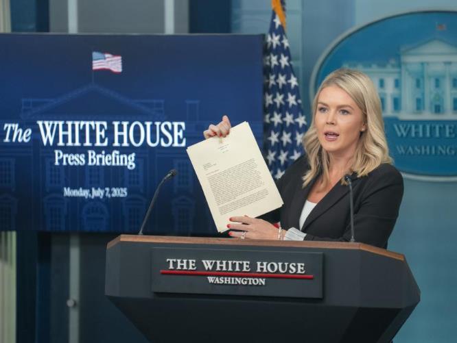 7月7日,在美國(guó)首都華盛頓白宮,白宮新聞發(fā)言人卡羅琳·萊維特在記者會(huì)上展示美國(guó)總統(tǒng)特朗普致日本首相的信函。新華社記者胡友松攝