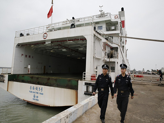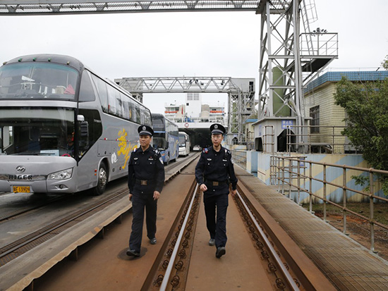 火車輪渡南港派出所副所長張曉攜民警戈丹巡邏輪渡碼頭。張新新 攝