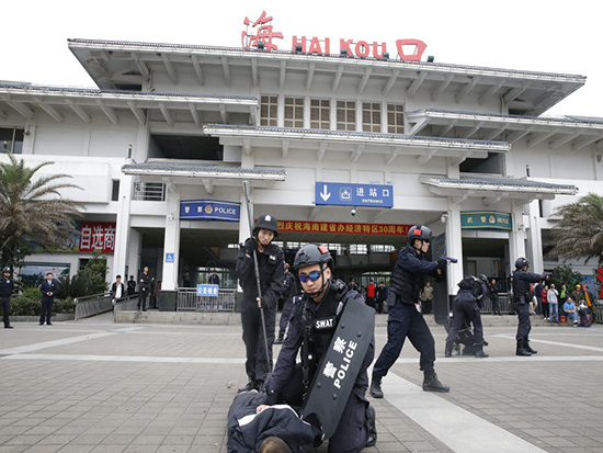 當(dāng)天上午10時,??谲囌菊厩皬V場,忽然沖入1名“暴徒”手持砍刀“追砍”群眾。