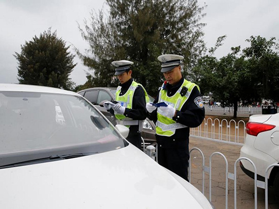 ??阼F路公安處交通警察支隊(duì)民警蔡啟中檢查過海車輛。張新新 攝