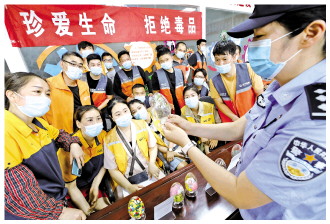 6月22日,安徽省淮北市總工會聯(lián)合淮北市公安局相山分局西區(qū)派出所開展禁毒宣傳走進物流園區(qū)活動,現(xiàn)場通過仿真毒品展示、發(fā)放宣傳單、承諾簽名等形式,向物流從業(yè)人員宣傳毒品種類、毒品辨別、毒品危害等知識,倡導遠離毒品健康生活。圖為民警向物流從業(yè)人員宣傳禁毒知識。