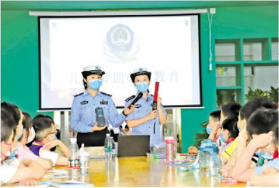 安徽省蕪湖市公安局交警支隊民警近日走進南陵縣畢家橋書房,向在場的30余名小學生宣講道路交通、防溺水等安全知識。圖為民警向小學生展示酒精測試儀等警用裝備,講解其作用和意義。