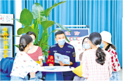 圖為7月19日,民警在阜南縣鹿城鎮(zhèn)六里社區(qū)警務(wù)站為大學(xué)生講解防范電信詐騙常識。