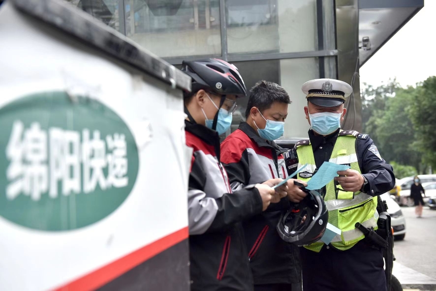 圖為11月2日,四川省綿陽(yáng)市公安局交警支隊(duì)直屬一大隊(duì)民警走進(jìn)轄區(qū)快遞企業(yè)開展交通安全宣傳活動(dòng)。 本報(bào)通訊員 張悅 攝