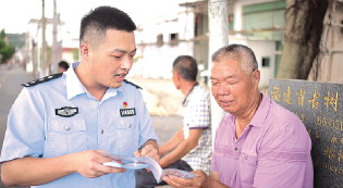 圖為施曉健進(jìn)村居對老人進(jìn)行反詐宣傳。 漳州市公安局龍文分局供圖