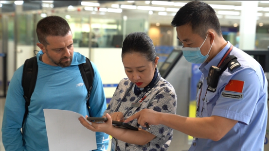 7月16日,昆明長水國際機場口岸迎來云南省144小時過境免簽政策停留范圍擴大后首位入境旅客,昆明出入境邊防檢查站移民管理警察為該旅客提供通關服務。 徐彥 攝