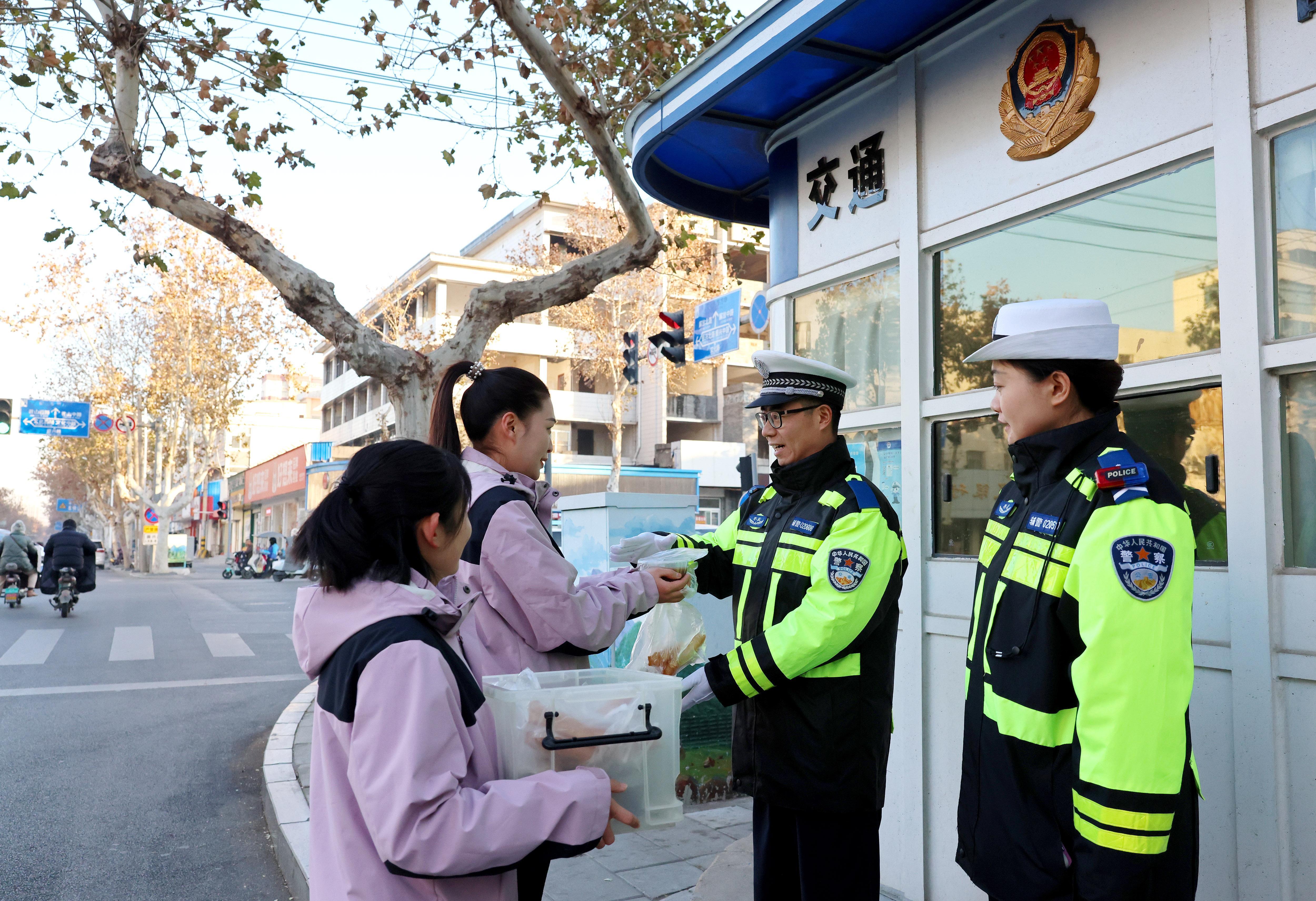 1月7日,山東省棗莊市市中區(qū)文化路絲雨幼兒園老師向崗?fù)ぶ蛋嗟慕煌ㄝo警送上臘八粥。