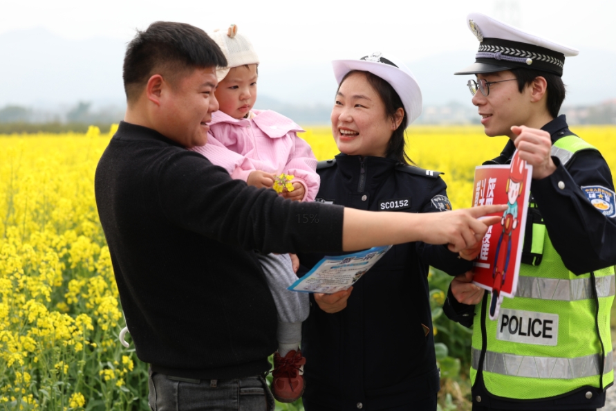 3月11日,江西省吉安市遂川縣舉辦以“花海遂川·美麗田園·共赴春日盛宴”為主題的油菜花賞花季活動。遂川縣公安局交警大隊全力維護(hù)沿線道路交通秩序,并組織民輔警走進(jìn)花海,向游客宣傳交通安全法律法規(guī)。