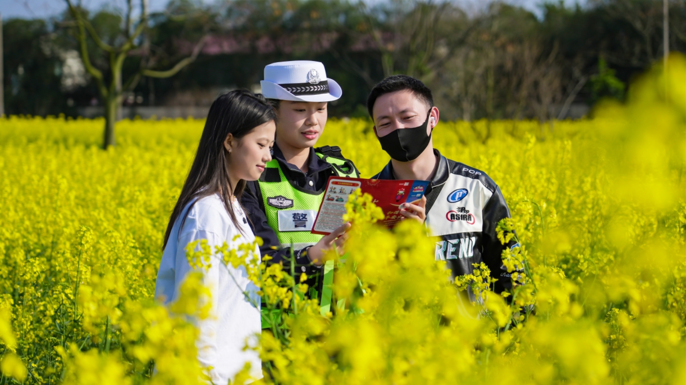 陽春三月,江西省新余市數(shù)萬畝油菜花競相綻放,吸引大批游客前來打卡拍照。新余市公安局交警支隊(duì)加強(qiáng)警力調(diào)度,開展巡邏防控,疏導(dǎo)交通秩序,并組織民警面對面向游客宣講交通安全法規(guī)。