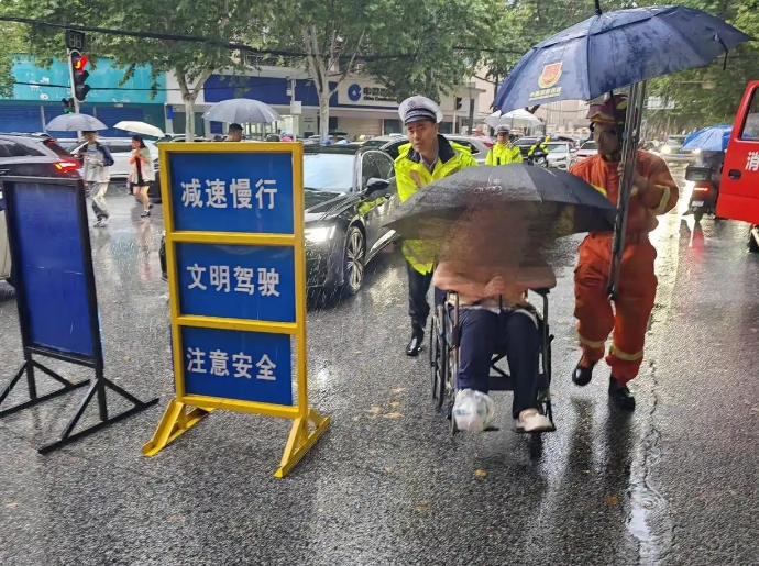 幫考生拉開(kāi)車(chē)門(mén),為忘帶雨具的考生撐傘,固定考生被風(fēng)吹翻的雨衣……暴雨中,劉明智和戰(zhàn)友們?nèi)珕T上陣,織密應(yīng)急服務(wù)網(wǎng)絡(luò),考點(diǎn)周?chē)縿?dòng)著緊張而溫暖的“護(hù)考潮”。