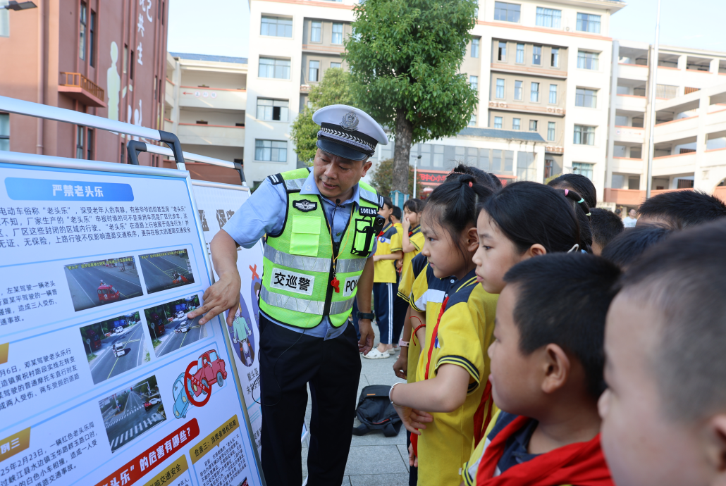 圖為9月3日下午,民警在雩田中心小學利用展板向學生講解“一盔一帶”的重要性。