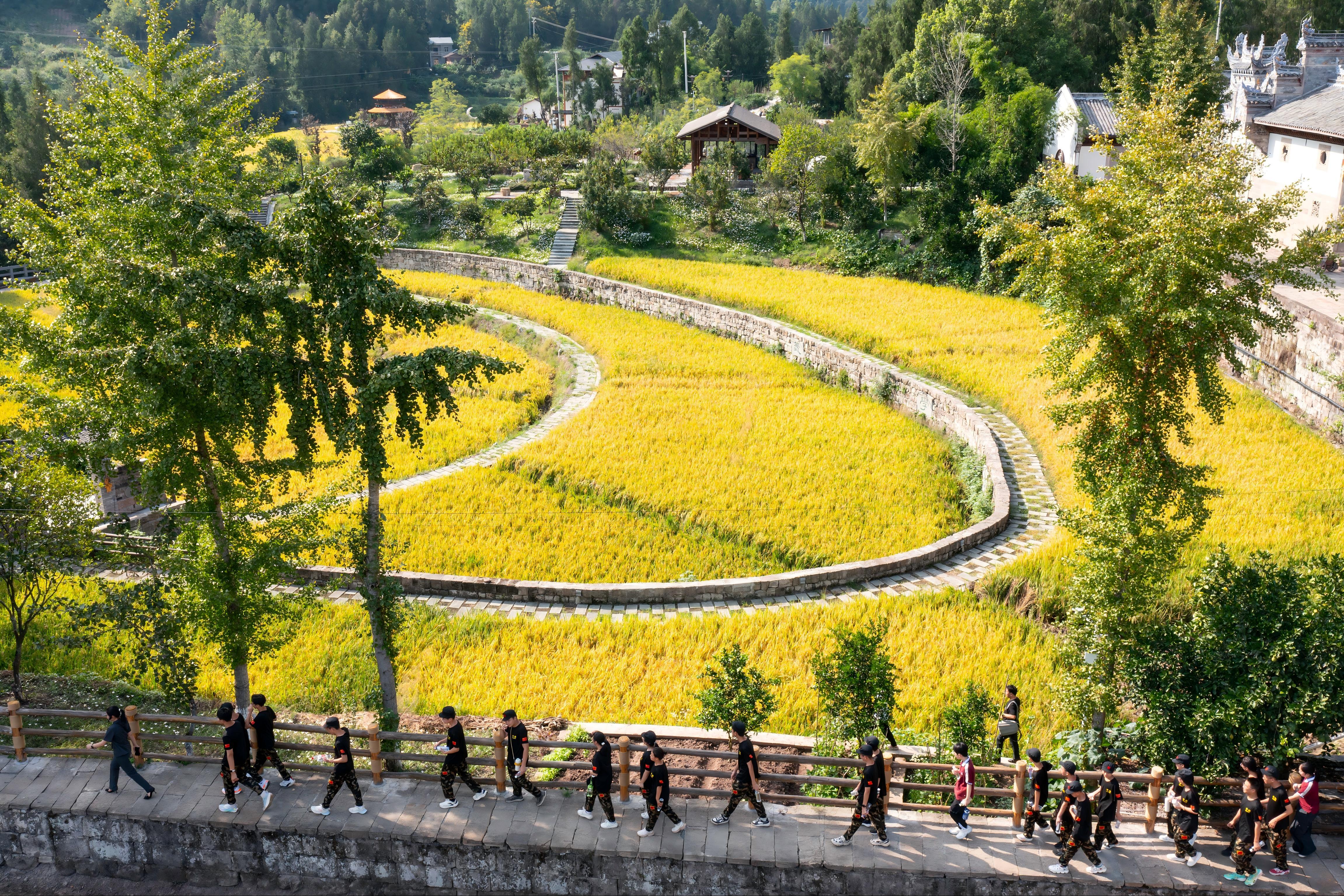 9月4日,重慶市云陽縣人民法院組織重慶市中山外國語學(xué)校百余名高一新生,在軍訓(xùn)實(shí)踐日走進(jìn)黎明古村。學(xué)生們深入田間地頭,體驗(yàn)收割稻谷;走進(jìn)“稻田里的巡回審判”研學(xué)基地,探尋法治印記,聆聽法官帶來的“開學(xué)第一課”?;顒右浴皠趧?普法”的新穎形式,將法治種子如稻穗般扎根學(xué)生心田。