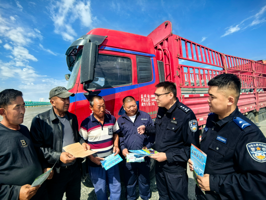 圖為9月10日,廟爾溝派出所民輔警開展規(guī)范裝載貨物、拒絕疲勞駕駛等交通安全知識宣傳活動。