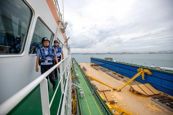 圖為邊檢37401新型執(zhí)法船艇護(hù)航“中國制造”起運(yùn)出境。
