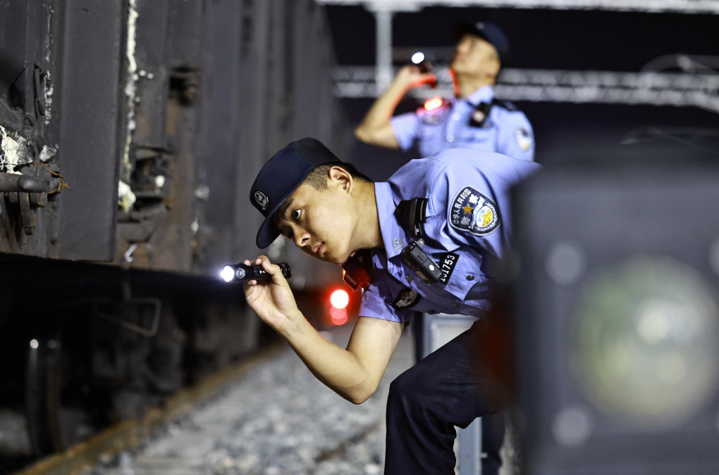 圖為9月23日晚,烏魯木齊鐵路公安局庫爾勒公安處若羌站派出所民警對(duì)站停貨運(yùn)列車進(jìn)行夜間安全巡視。