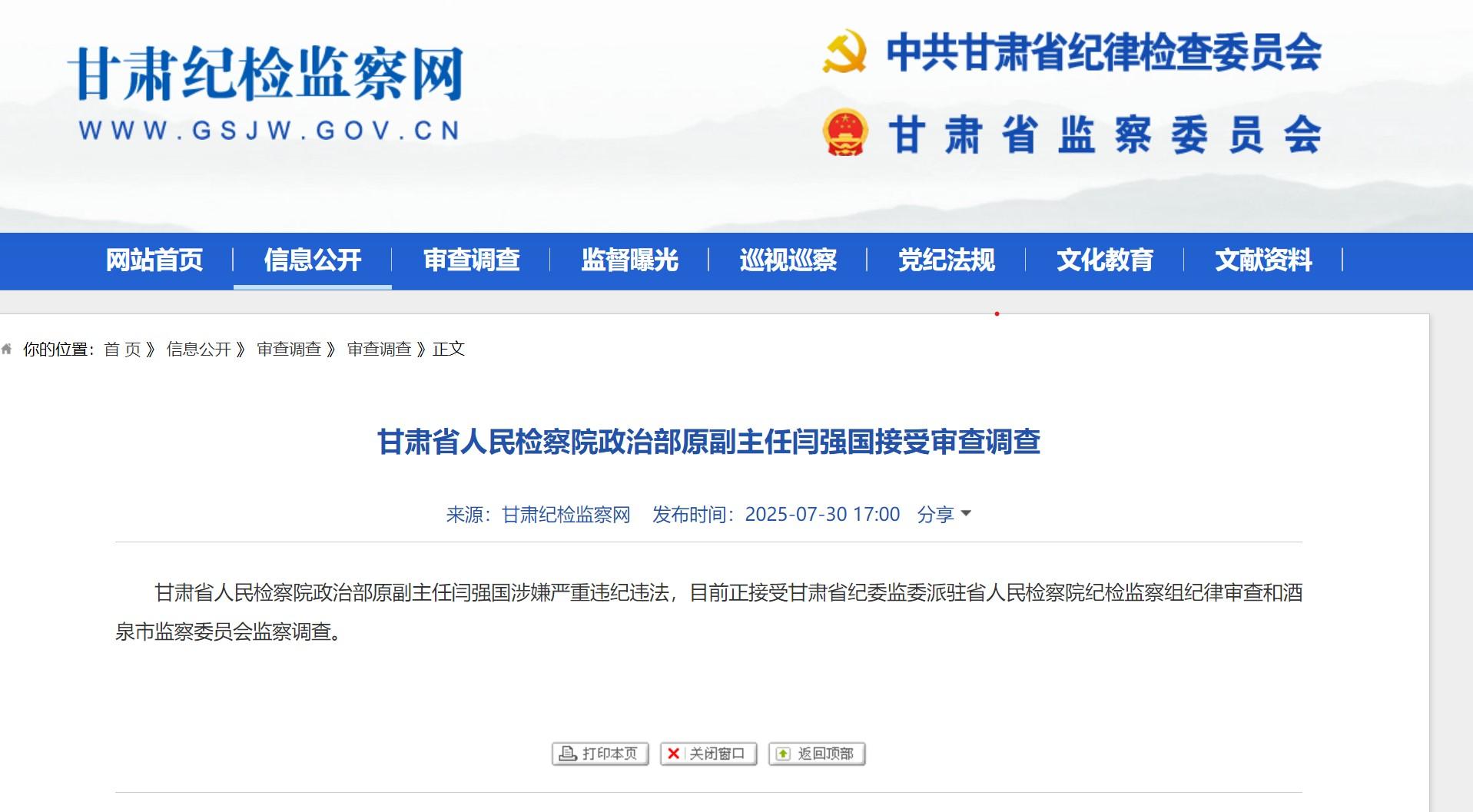 據(jù)甘肅紀檢監(jiān)察網(wǎng)7月30日消息,甘肅省人民檢察院政治部原副主任閆強國涉嫌嚴重違紀違法,目前正接受甘肅省紀委監(jiān)委派駐省人民檢察院紀檢監(jiān)察組紀律審查和酒泉市監(jiān)察委員會監(jiān)察調(diào)查。