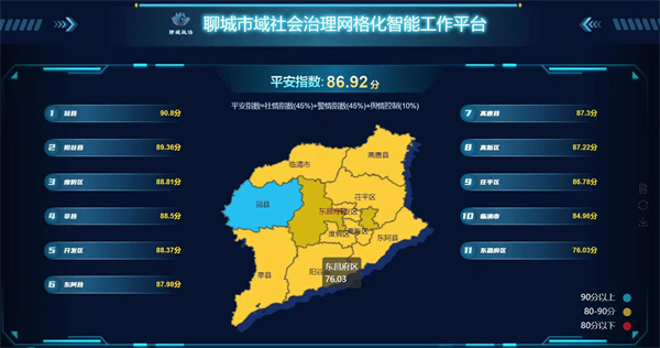 試點(diǎn)工作中,聊城市運(yùn)用市域社會(huì)治理智能化平臺(tái)助力深化平安建設(shè),在平臺(tái)定期生成全市“平安指數(shù)”,涵蓋各縣區(qū)社會(huì)治安、道路交通、安全生產(chǎn)等10項(xiàng)指標(biāo),引導(dǎo)精準(zhǔn)查找、整改短板問(wèn)題。針對(duì)重大活動(dòng),發(fā)揮平臺(tái)研判決策、指揮調(diào)度功能,對(duì)問(wèn)題及時(shí)發(fā)現(xiàn)處置,助力工作嚴(yán)格落實(shí)。