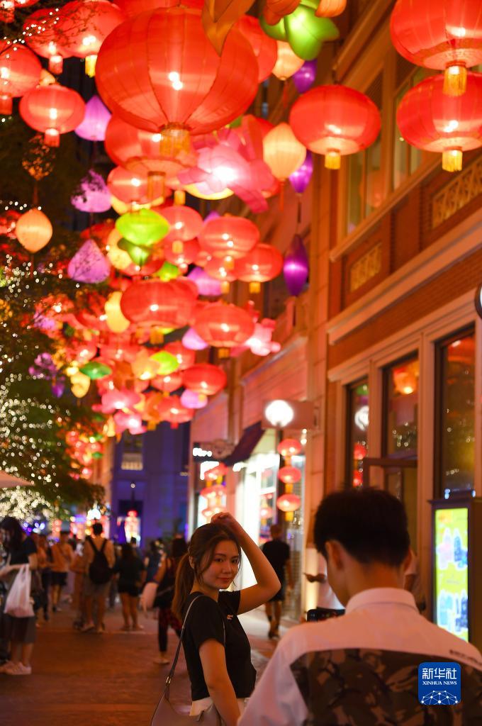 9月17日,人們?cè)诶麞|街觀賞彩燈。