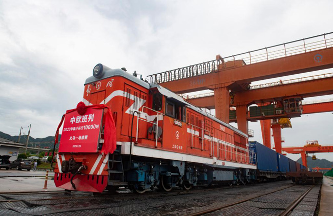 7月29日,滿(mǎn)載110個(gè)標(biāo)箱出口貨物的X8020次中歐班列從鐵路義烏西站鳴笛啟程。新華社發(fā)(時(shí)寬兵攝)