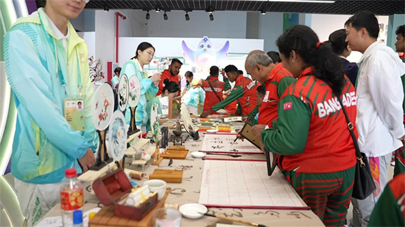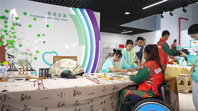 品嘗過(guò)美食,想要放松心情,志愿服務(wù)中心是個(gè)好去處。孟加拉國(guó)代表團(tuán)的運(yùn)動(dòng)員們,正在“小青荷”的引導(dǎo)下參觀志愿服務(wù)文化展、體驗(yàn)各類(lèi)互動(dòng)活動(dòng)。