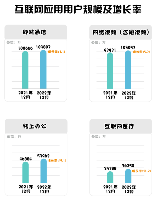 2022 年,我國各類個人互聯(lián)網(wǎng)應(yīng)用持續(xù)發(fā)展。即時通信的用戶規(guī)模保持第一, 較 2021 年 12 月增長 3141 萬,使用率達(dá) 97.2%;網(wǎng)絡(luò)視頻(含短視頻)用戶規(guī)模達(dá)10.31億,其中短視頻用戶規(guī)模達(dá)10.12億;互聯(lián)網(wǎng)醫(yī)療、線上辦公的用戶規(guī)模 較 2021 年 12 月分別增長 6466 萬、7078 萬,增長率分別為 21.7%、15.1%。