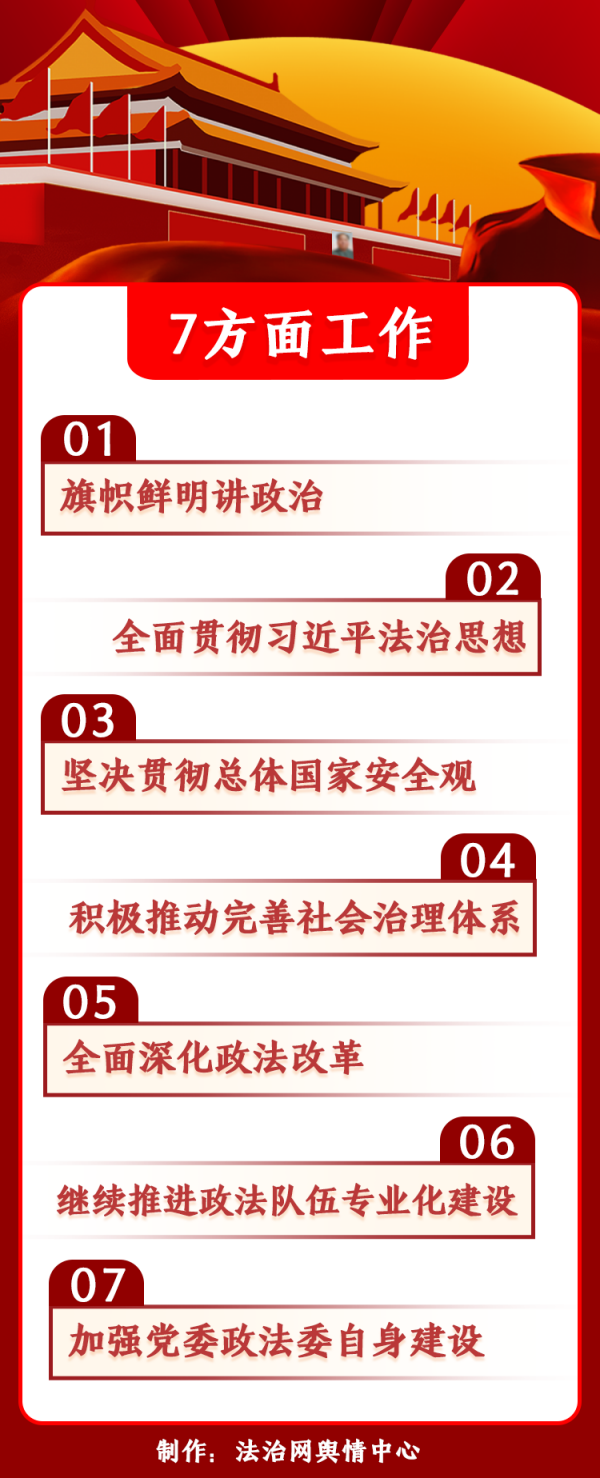 會議要求抓好七方面工作:旗幟鮮明講政治;全面貫徹習(xí)近平法治思想;堅(jiān)決貫徹總體國家安全觀;積極推動完善社會治理體系;全面深化政法改革;持續(xù)推進(jìn)政法隊(duì)伍專業(yè)化建設(shè);加強(qiáng)黨委政法委自身建設(shè)。